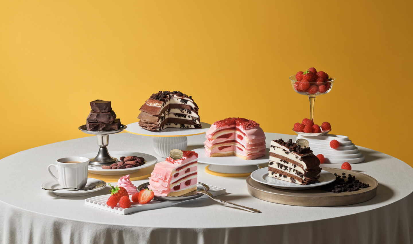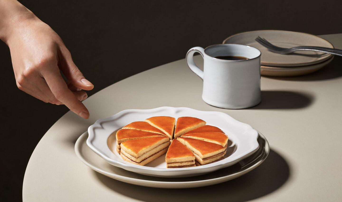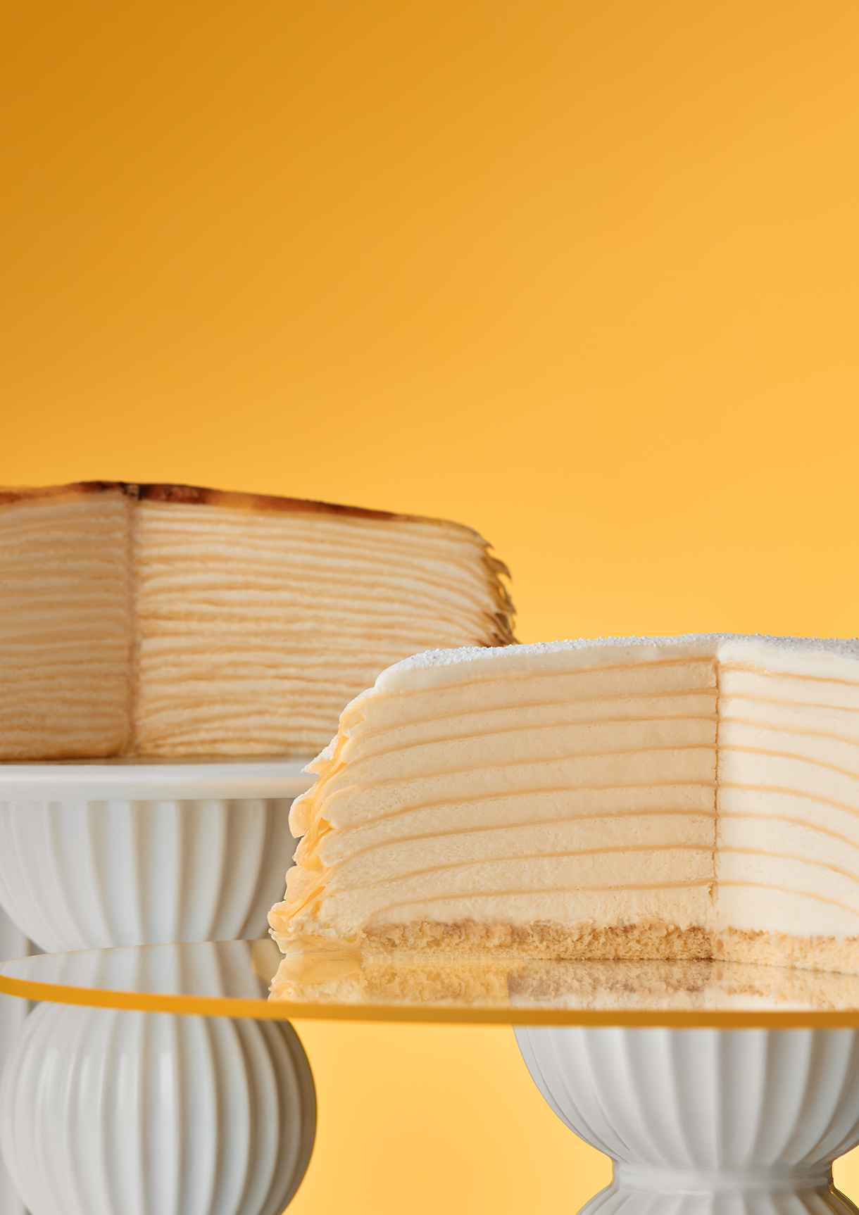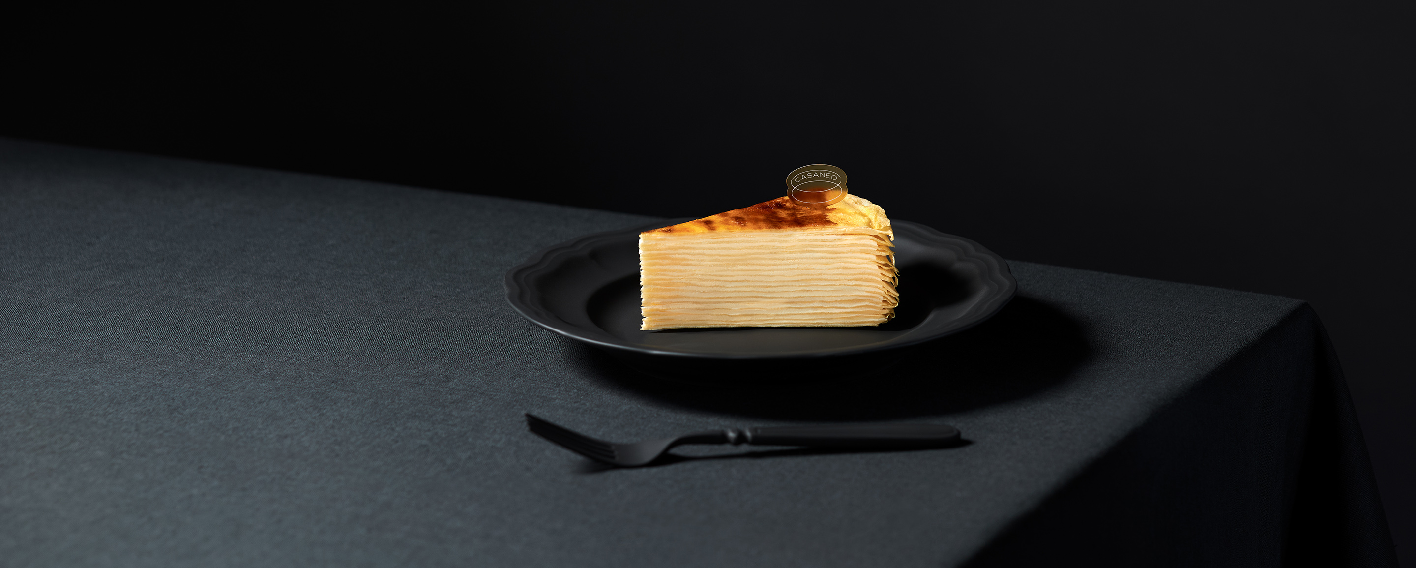 食器やオブジェを層状に重ねたスタイリングと、伝統と現代のトーンが交差するテーブルコーディネートによって、ブランドの由来となった「重ねる」と「新しさ」を表現した。プロダクトビジュアルでは、ミルクレープの「層」の美しさにフォーカス。薄い生地が幾重にも重なったシズル感を訴求している。