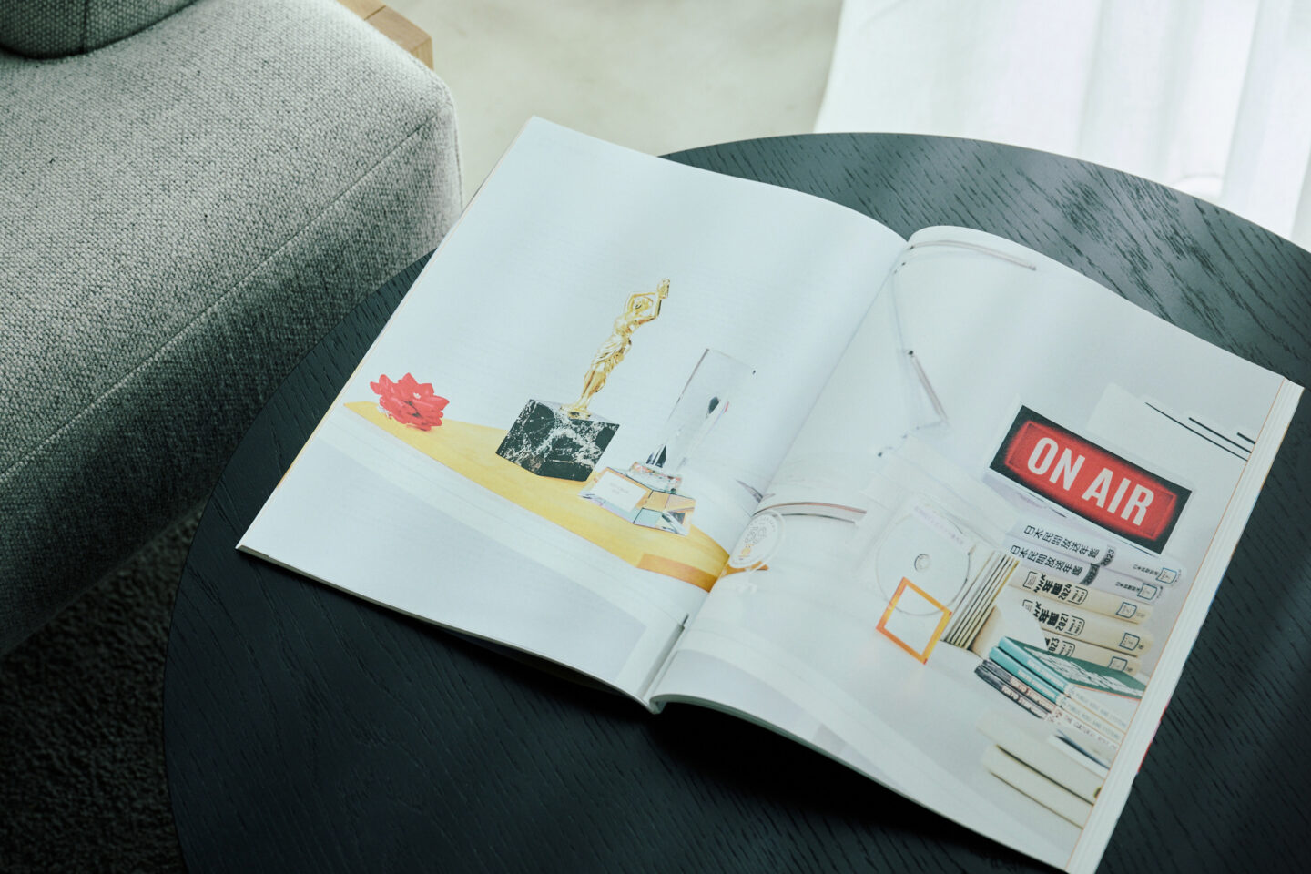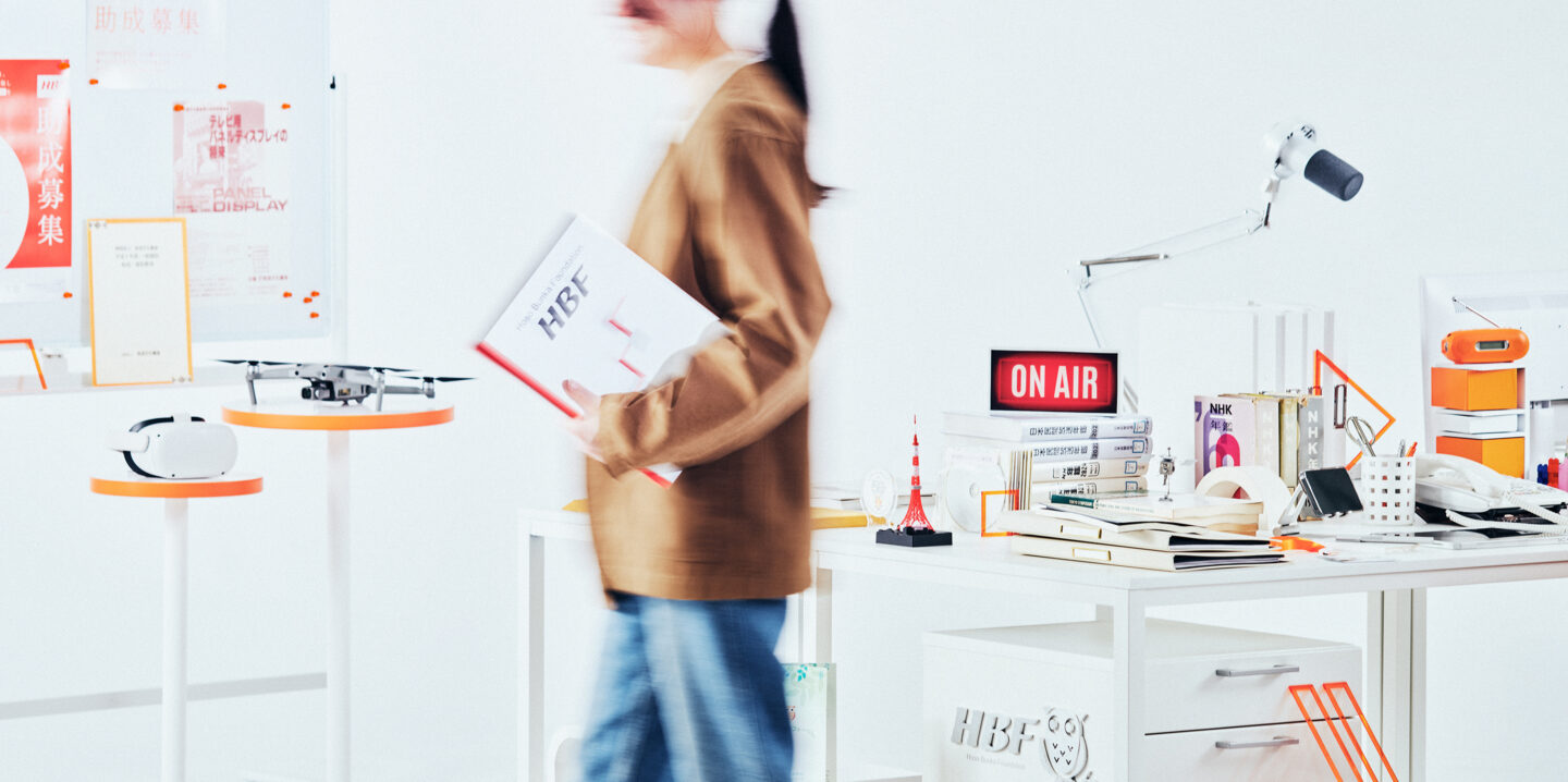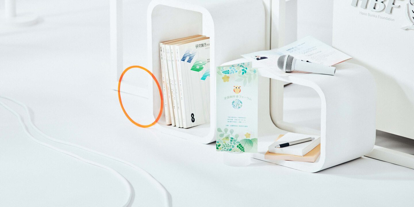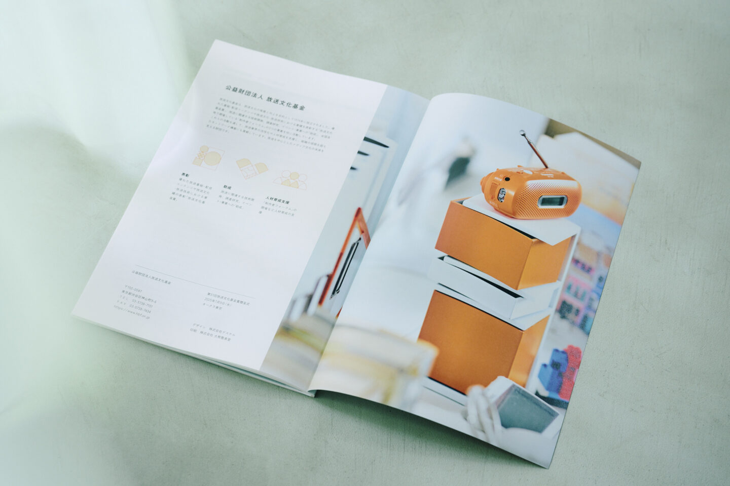 白を基調にオレンジと黄色をアクセントに用いることで、公共性や社会性を意識したシンプルで信頼感のあるトーンに統一した。また、放送文化を築いてきた「モノ」を画面の中心に据え、それらを支える存在として「人」の気配をさりげなく演出。未来に向けた支援の姿勢が伝わるビジュアルを目指している。